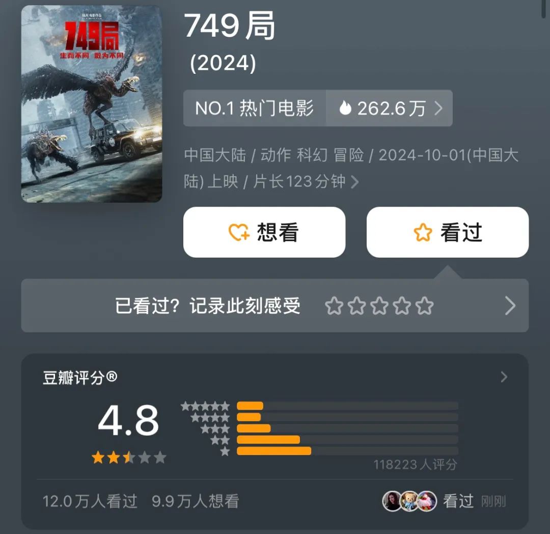 正如國慶檔的另一部特效鉅製《749局》。因資金問題停擺,歷時八年才徹底殺青,艱難上映。而該片的上映情況和幕後一樣充滿戲劇性。原本,《749局》在預售階段領跑,形勢一片大好。但開畫後不久,“難看”詞條就衝上微博熱搜,第一批觀眾紛紛反映特效與劇情拉垮,豆瓣開分為5分,目前已跌至4.8分。口碑與票房崩盤,次日票房跌至8000萬以下,不少網友將其比作新一版的《上海堡壘》。