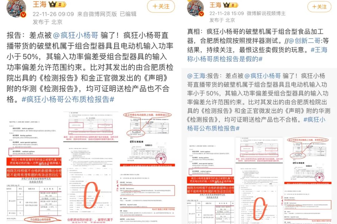“王海”也是互聯網老打假人了。其最有名的戰績是2022年底向“瘋狂小楊哥”開炮,稱其直播間售賣的破壁機和絞肉機均為虛標功率。針對辛吉飛的打假也不是第一次了,早在去年八月,“王海”就稱“辛吉飛”帶貨的奶粉有違禁成分,檢測結果為有毒有害產品。