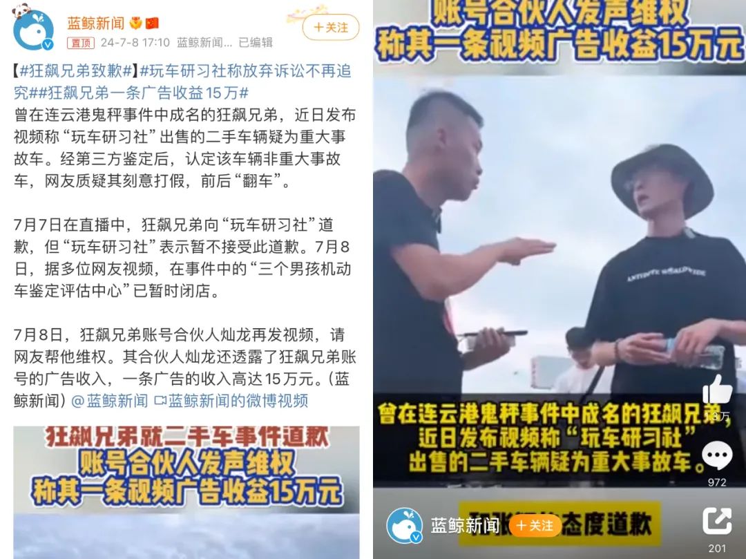 “狂飆兄弟”也因帶着粉絲上門打假,指控“玩車研習社”出售的二手車輛為重大事故車,但經過第三方鑑定後,結果顯示車輛並無重大事故痕跡,“狂飆兄弟”最終也公開道歉,持續掉粉。