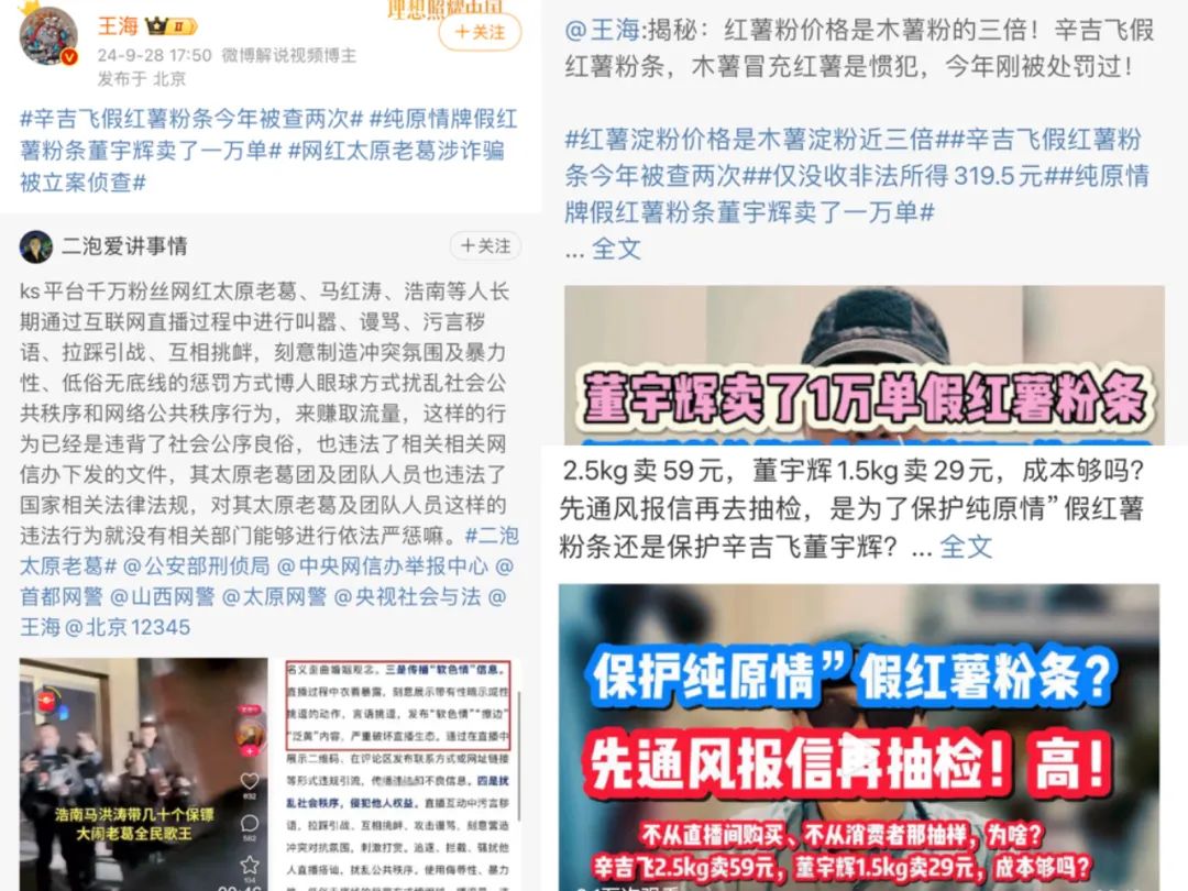 8月16日,“打假人”王海稱在網紅“辛吉飛”直播精選賬號購入“純原情手工紅薯粉條”,購入後直接將其送到實驗室進行兩次檢測,第一次檢測出木薯成分,第二次檢測則未檢出紅薯成分。