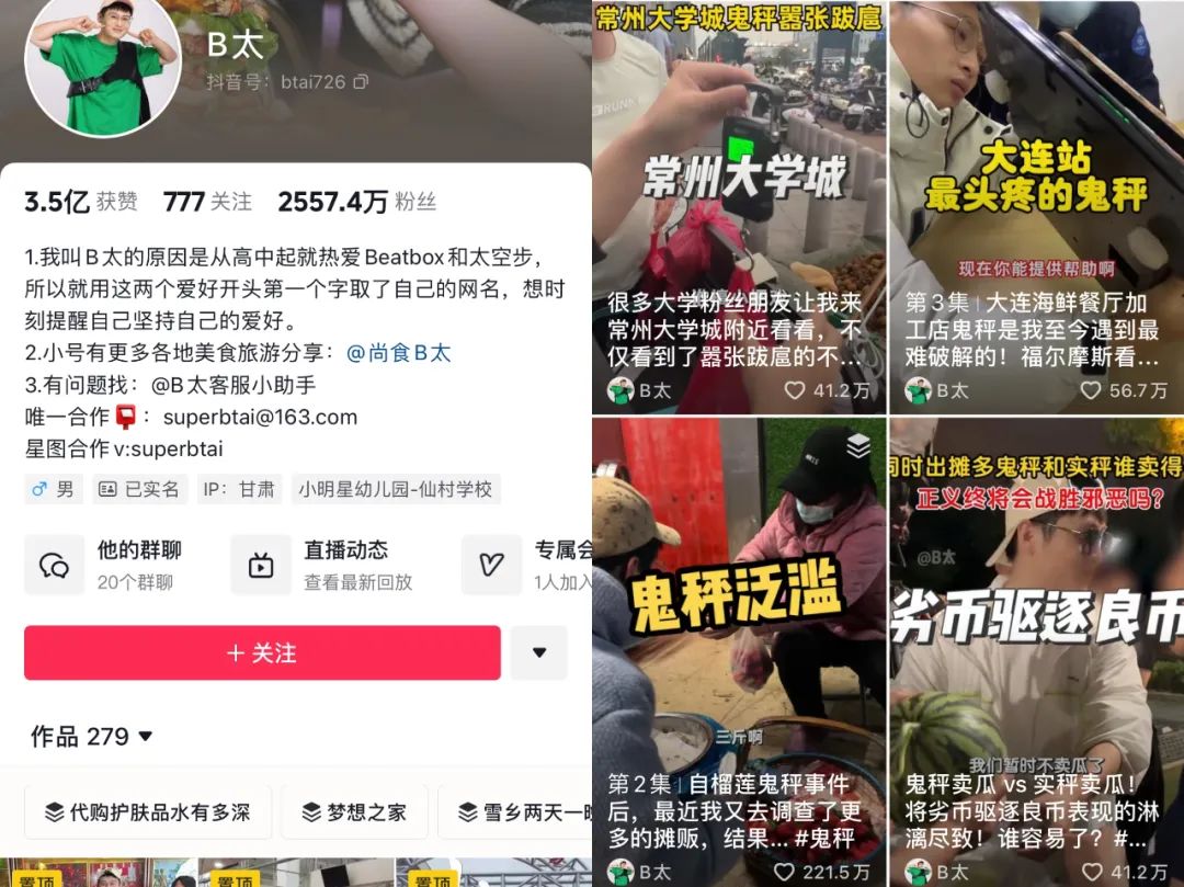 比如2018年以美食博主進軍短視頻的“B太”,在2023年轉型為打假博主,憑藉在全國各地打假“鬼秤”的內容暴漲百萬粉絲,這也啓發了其他眾多博主,紛紛轉入“打假賽道”,這也可以説是全網最沒有門檻的賽道,只要你説自己有顆“正義”的心。