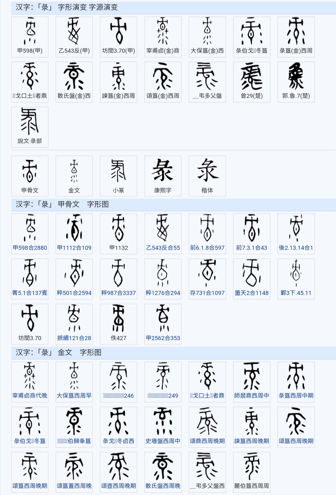 衍生逯剝録祿淥綠字,引用為剝刻甲骨青銅、記録、錄用任用名錄俸祿、氧化變綠、滲淥、紅橙黃綠藍紫。