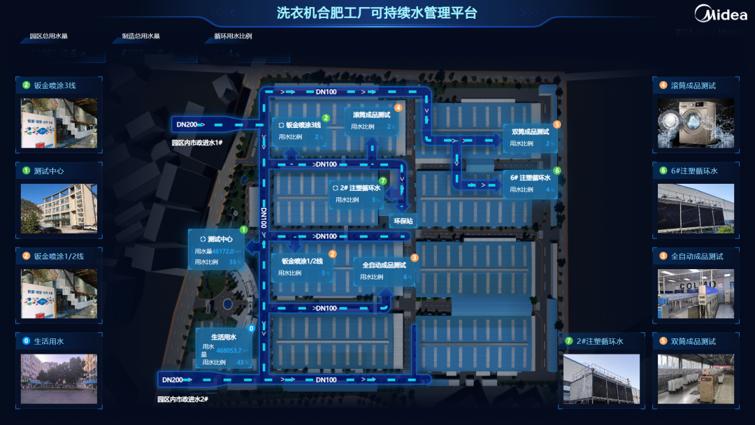 生產製造企業是用水大户,能否做好水資源管理是衡量工廠是否達到可持續發展的關鍵指標。美的洗衣機合肥工廠率先上線智能水孿生系統,工廠內各個用水場景通過物聯網技術採集關鍵數據,並集成至工業水孿生的控制系統,通過對歷史數據的深度訓練、學習,迭代出可持續的調控策略,控制各項子場景。