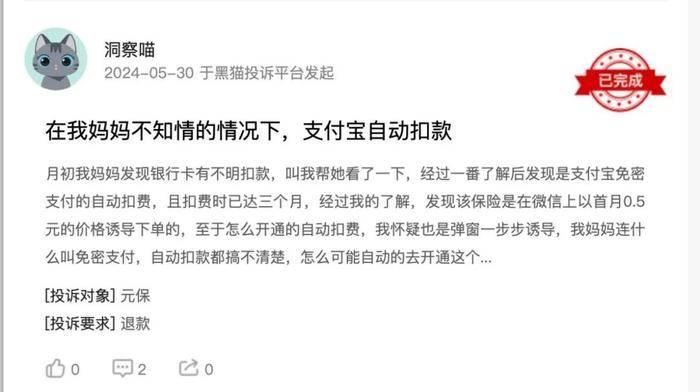 黑貓投訴平台上,元保相關投訴共有1181條,其中不乏“惡意扣款”“虛假宣傳”等嚴重問題。有消費者反映,在不知情的情況下被擅自扣除費用,或者被開通了自動扣款服務,而一旦發現問題,想要退款卻困難重重。這些投訴不僅損害了消費者的權益,也讓元保的口碑直線下滑。