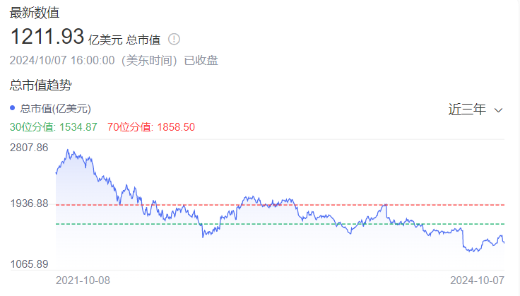 自從2021年抵達巔峯之後,耐克市值就開始跌跌不休,從超過2600億美元暴跌到1210億美元左右,跌幅過半。