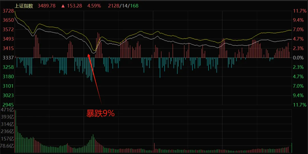 隨後暴跌6%,總漲幅跌至1%,和開盤價相比大盤已跌去了9%。
