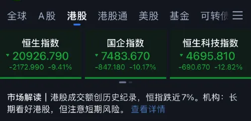 不然像港股和海外的A50指數,國慶節期間偷襲式暴漲,開盤後我們從漲停開始下跌,他們就只能跟着跌,結果恒生指數的大盤出現了收跌接近9.4%的超級大陰線。