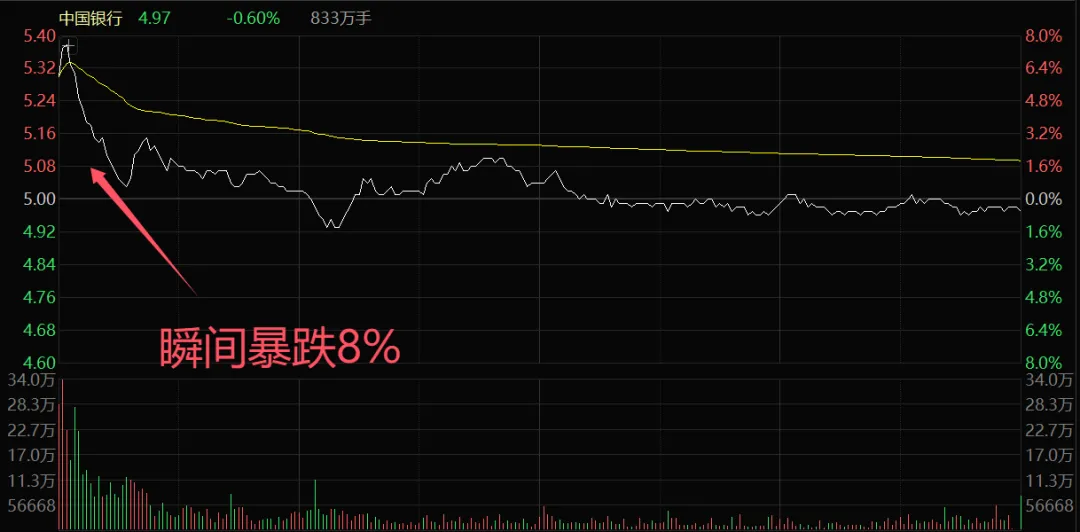 昨天的盤面上也可以看出端倪,開盤之後銀行股就瞬間巨量下砸,中國銀行這種巨無霸都能瞬間暴跌接近8%。