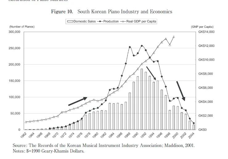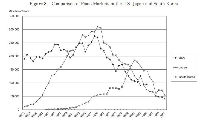 以日本為例,在1950年代末到1970年代初,日本鋼琴的生產和銷售都呈現出顯著增長的趨勢。到了1975年左右,其年生產量接近40萬台,銷售量也突破了30萬台。1980年代初,鋼琴的生產和銷售都開始大幅下降。儘管人均GDP繼續穩步增長,但鋼琴市場飽和。