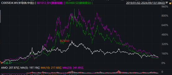 半個月前,在這輪猝不及防的大行情尚未嶄露頭角前,把半導體行業指數,跟光伏龍頭隆基綠能、鋰礦龍頭贛鋒鋰業的股價走勢圖進行疊加(見下圖),會意外的發現,大家除了波動率,5年之後的結局,居然完全是殊途同歸。