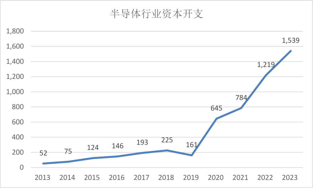 以A股上市的半導體公司作為統計樣本,2019年開始國產替代大幕開啓後,半導體的投資體量幾年內快速跨過1500億元門檻,幾乎達到2019年的10倍。而這還只是統計了上市主體,我們還沒有説各地政府支持的十幾家晶圓代工廠。