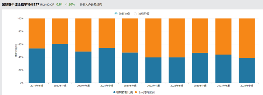 但實際情況卻不是這樣的。還是以上面舉例的那隻基金為例,在持有人中,不僅僅是普通的基民,機構持有人佔比穩定在接近一半的水平,而其他芯片指數基金,機構的持倉比重,也只多不少。