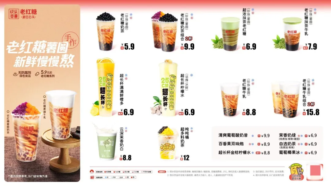 且快樂番薯2000家的門店體量,也沉澱了一定的市場認知,把“薯圓”作為核心產品標籤,既承接了珍珠奶茶的勢能,又形成了差異化的品牌特色。