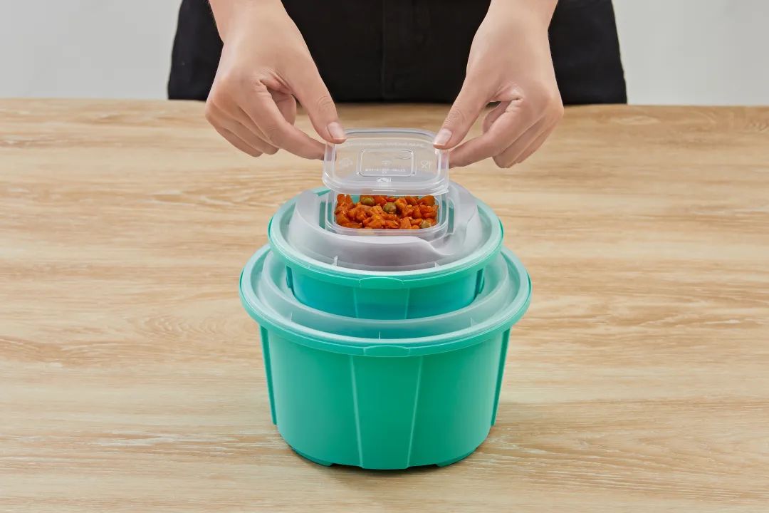 針對砂鍋菜,金億佳鑫則採用了上下分離的疊放設計,把兩個大小不同的餐盒疊放在一起。小的餐盒裝米飯,盒蓋內還暗藏了內陷蓋,可以再放鹹菜等小料。大的餐盒裝熱菜。不僅節約了空間,還讓米飯實現了更好的保温效果。