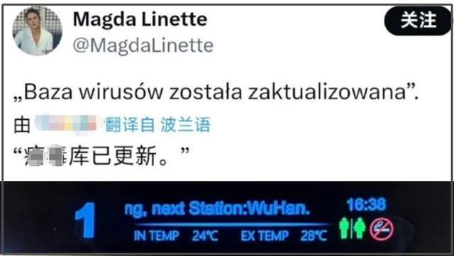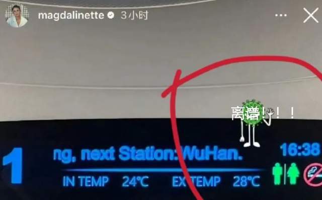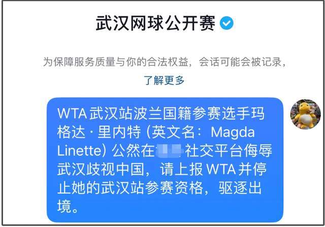 瑪格達·裏內特出生於1992年,最近她接連參加了2024年中網、武網兩大網球公開賽,在結束中網比賽前往武網參賽的途中,裏內特更新了一條社媒動態,配圖是一張高鐵車廂報站牌照(上面清晰顯示武漢的拼音),配文是“病毒庫已更新”,瞬間引發爭議。
