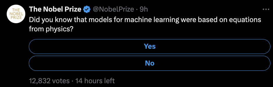 諾獎官方下場問網友:你知道機器學習的模型是基於物理學方程的嗎?|圖片來源:X