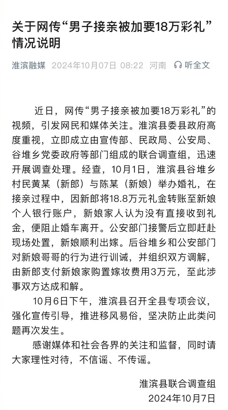 當地多家部門介入,羣策羣力和稀泥,最後要求新郎官再給新娘子家人打3萬塊錢,算是新娘嫁妝費用,OK?