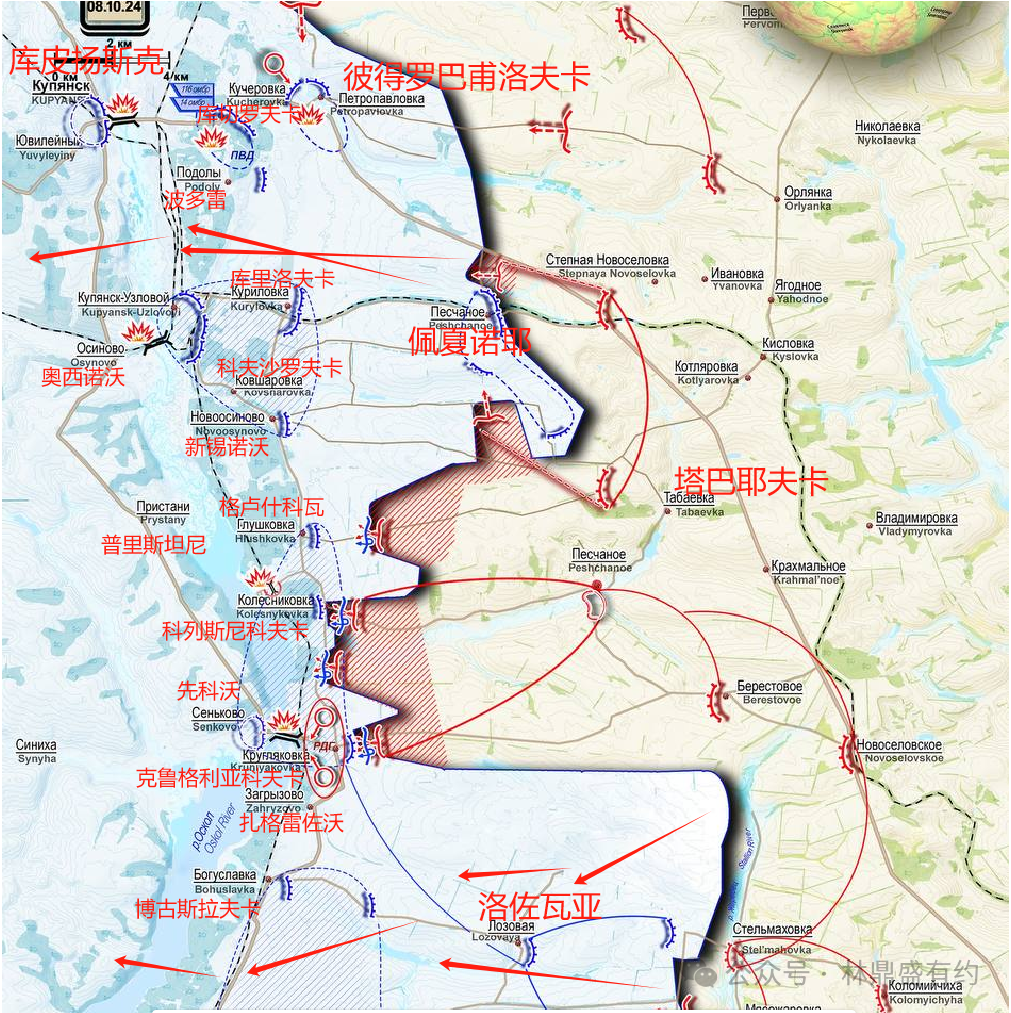 🔴一旦俄軍奪佔佩夏諾耶,就有機會向西大縱深推進,拉齊與扎格雷佐沃-克魯格利亞科夫卡-先科沃-科列斯尼科夫卡-格盧什科瓦之間的戰線,那麼,這些定居點只要有一個定居點被俄軍切斷,那麼,庫皮揚斯克與其東南部的城鎮羣的聯繫和補給線(尤其是鐵路線)將也會被切斷。下一步,就看俄軍是否願意在這個方向投入重兵,實施切割戰術了。可以設想,如果戰線拉齊的基礎上,且俄軍要想來個掐頭去尾,北部切斷波多雷,南部奪取洛佐瓦亞和博古斯拉夫卡南端,則可能會在庫皮揚斯克南部形成一個巨大的包圍圈,當然,也可能會對庫皮揚斯克本身從南部發起迂迴包夾。後續還得看如何演變,如果出現我所説的情況,就説明,俄軍可能會正在由很厲害的軍事專家在指揮。