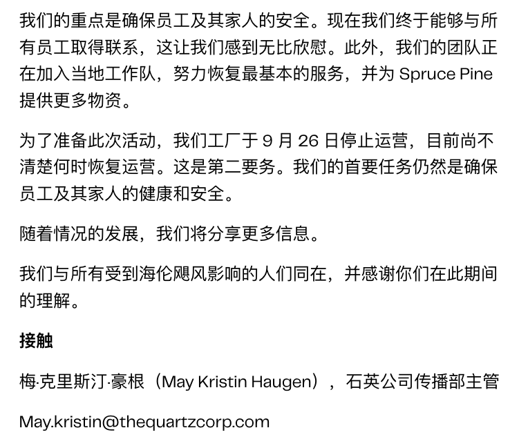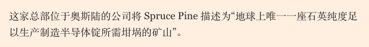 所以一旦 Spruce Pine 的礦區沒法兒正常運營,説下游的芯片製造會停擺,是真的有可能。包括光伏、光纖其他行業所需的高純石英,也會變得更加供不應求。