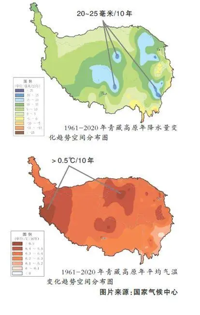 而降雨量也是如此,1961年至2020年,青藏高原年均降水量每10年增加7.9毫米。