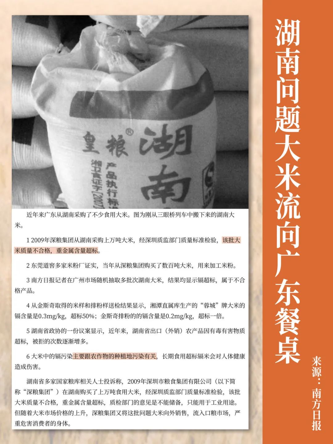 廣東最主要的糧食調入來源地是湖南,但湖南省又是全國耕地污染最嚴重的省份。在2009年,深圳、廣州、東莞分別檢測發現大米出現鉛、鎘、砷等重金屬超標的現象,再一查,都是來自湖南。2020年,又爆出雲南昭通查出一批來自湖南益陽的大米重金屬超標,土壤修復的任務十分緊迫。