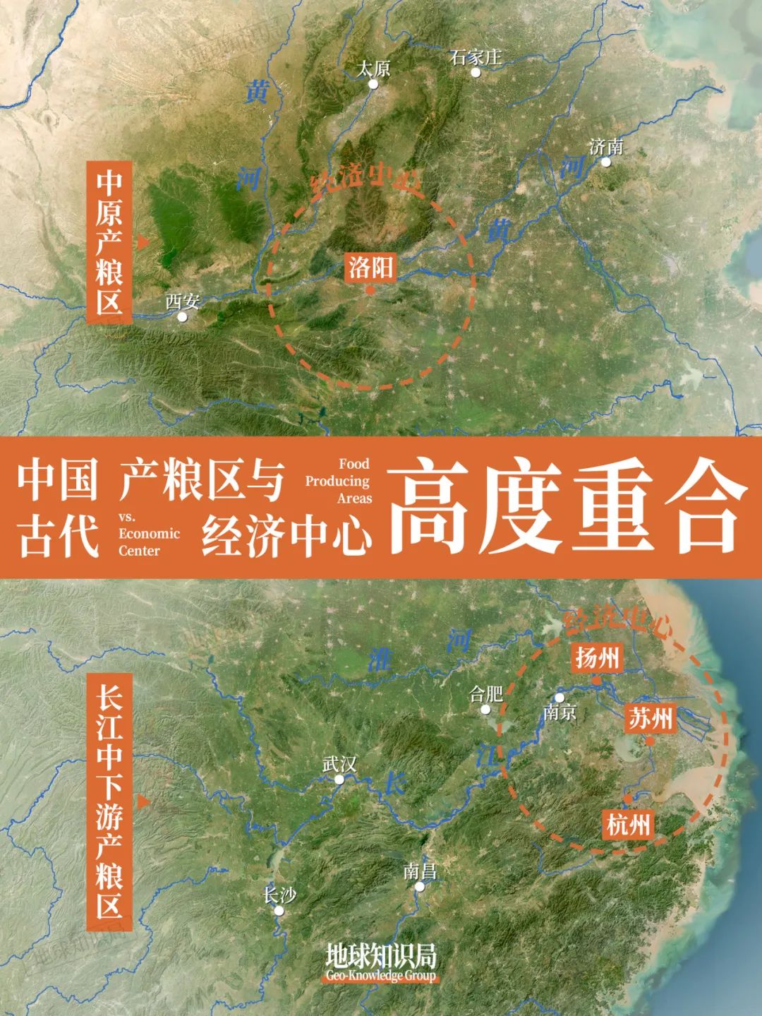當中原是產糧區時,經濟中心一般在洛陽;當長江中下游是產糧區時,經濟中心一般在揚州或者蘇杭。
