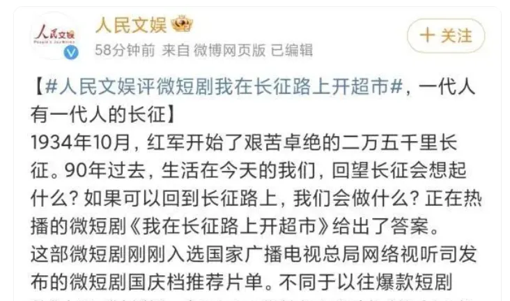 根據公開信息看,這部劇大概是官方命題作文,該劇由北京市廣播電視局指導,入選2024年“北京大視聽”重點網絡文藝項目,並獲廣電總局發佈的微短劇國慶檔片單重磅推薦,並有人民文娛、中國青年網等官媒新媒體矩陣進行宣傳(所謂藍V洗地)。這部劇大概率是某官方部門為了滿足當年宣傳任務,外包給社會企業的項目,並提前在系統內發函聯繫好了各種官媒宣傳預留宣傳板塊。