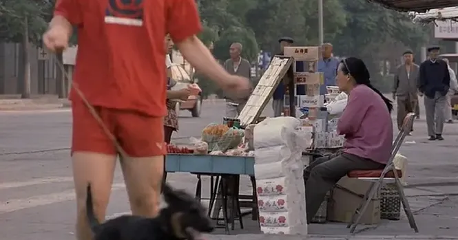 尋找輟學兒童進城的未成年教師魏敏芝在街邊詢問線索,路邊出現的是一個早起遛狗的普通居民。