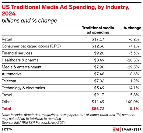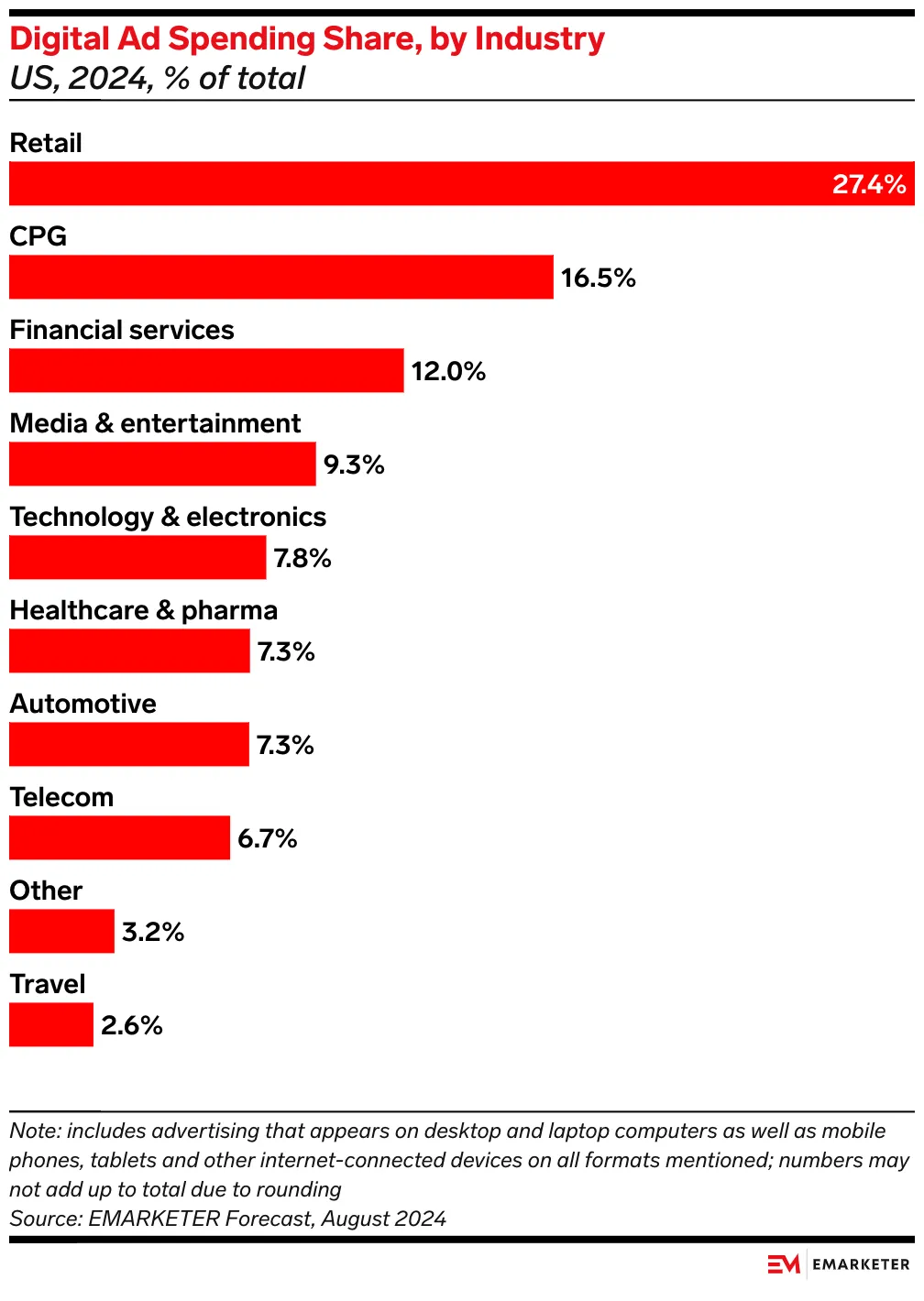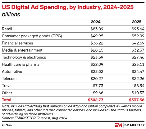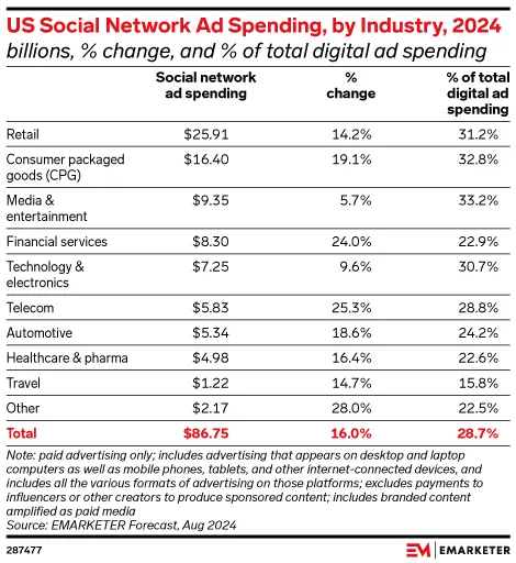 零售和快速消費品更依賴對社交廣告支出。2024年,Facebook、Instagram 和 TikTok 等社交媒體的廣告支出為 867.5 億美元,而這兩個行業將佔 423.1 億美元,相當於 48.8% 的份額。