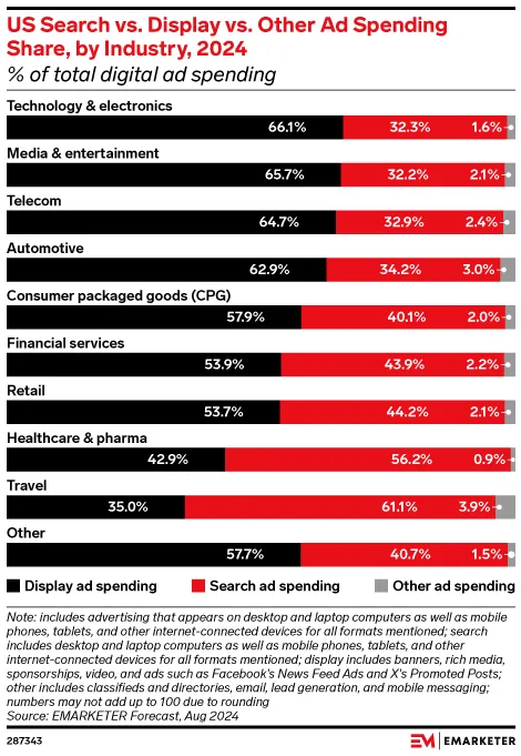 大多數行業都傾向於展示類廣告,但旅遊、醫療保健和製藥行業更青睞搜索廣告: