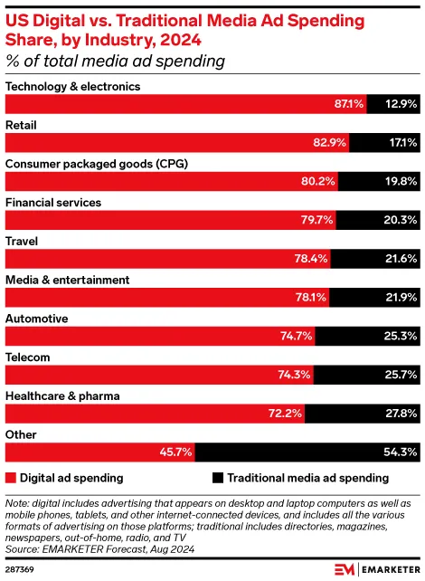 總體而言,今年 77.7% 的廣告支出將流向數字渠道,其中科技和電子行業(今年 87.1% 的支出為數字)幾乎已經放棄了傳統媒體。
