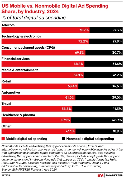 2024 年,美國數字廣告支出的 65.9% 將用於通過移動設備投放的廣告。經過多年的移動廣告份額增長,移動和非移動廣告支出已穩定在大約三分之二到三分之一的水平(移動廣告勢頭減弱可追溯到 CTV聯網電視的出現)。