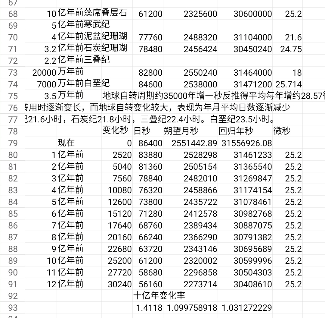 寒武紀每晝夜為20.8小時,泥盆紀21.6小時,石炭紀21.8小時,三疊紀22.4小時。白堊紀23.5小時。