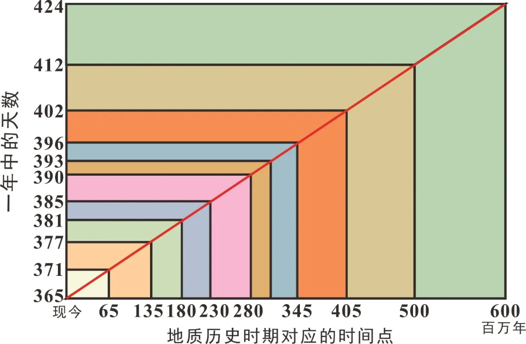 ②隕石太陽風導致地球月球公轉自轉用時逐漸變長,而地球自轉變化較大,表現為年月平均日數逐漸減少。