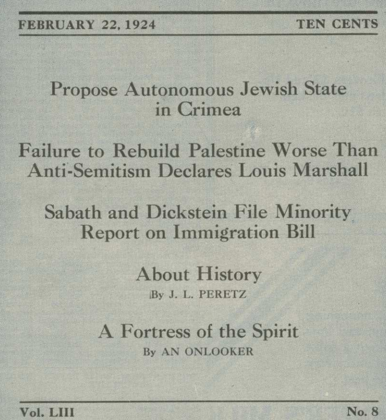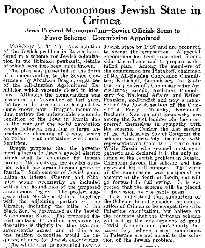 蘇聯成立後,猶太活動家亞伯拉罕·布拉金 (Abraham Bragin) 在莫斯科的全俄農業實驗展覽會上(他也是個農學家)提交了一份備忘錄:《提議在克里米亞成立猶太自治國(Crimea Propose Autonomous Jewish State ii)》,指出“對於蘇維埃俄國的猶太民眾來説,唯一的解決辦法就是在黑海沿岸和克里米亞進行大規模殖民”: