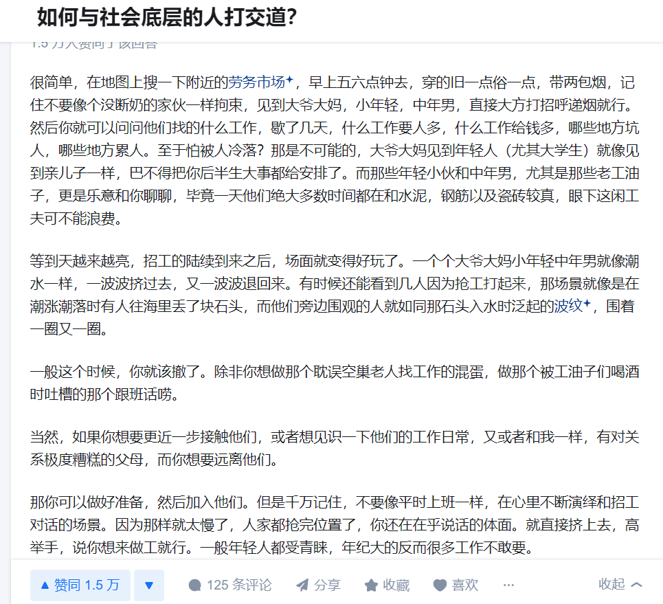 怎麼説呢?很多底層人民,有太多令人同情的一面,他們過得這麼辛苦,原因非常複雜,有社會的原因,尤其是當今資本主義社會,資本獲利太過於容易,而人的勞動價值反而……當然也有很多是他們自身的原因,我覺得,最主要就是太多底層網友,見識眼界太少,太偏執,不明白怎麼找到更好的人生出路。