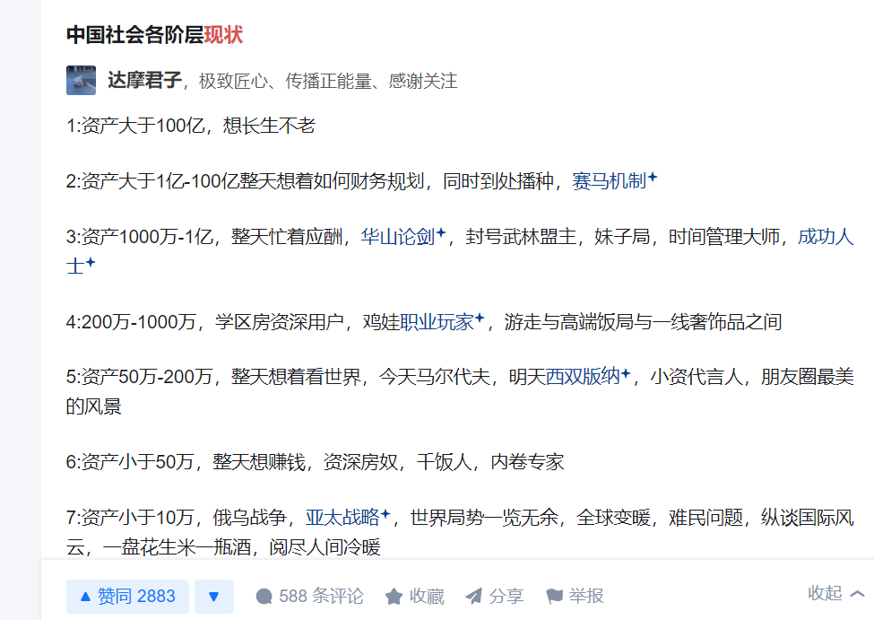 首先我要強調一句,大家都是社會底層,就社會地位來説,都是底層,都是普通老百姓,和權貴、富豪階層相比,大家都是底層。