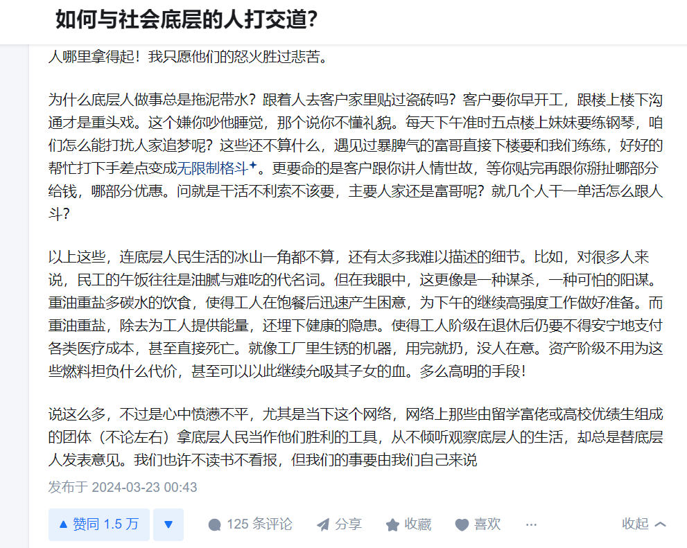 但不管是什麼原因造成了生活的艱難,但是正因為長期掙扎於艱難的生活,導致很多底層人民,底層網友,往往都有非常強烈的戾氣。