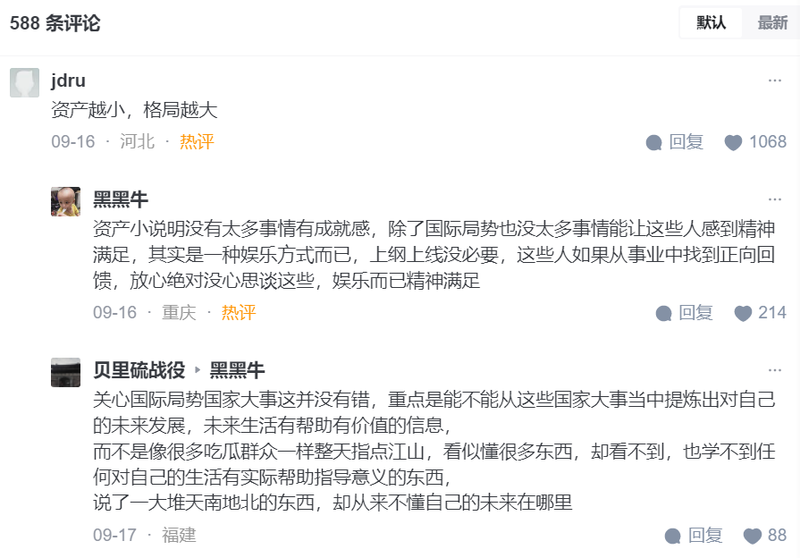 喜歡網上鍵政討論國家大事的底層網友,就像網上段子説的京城出租車司機,是因為生活中實在沒有別的娛樂方式了,他又沒法直接從抖音快手裏面獲得足夠娛樂,所以只能從指點江山裏面,獲得一些快樂。