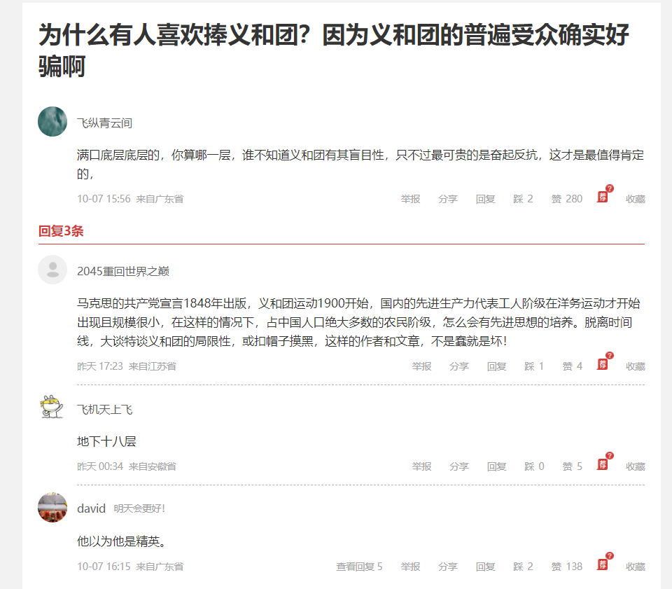 但我為什麼又要説一句底層網友呢?是因為,雖然大家社會地位都差不多,但是接受教育程度畢竟有區別,眼界認知畢竟有區別,思想觀念也還是有區別,尤其是對義和團這種問題的看法有區別,為了區別,我只好勉為其難,稱這些網友是底層網友。