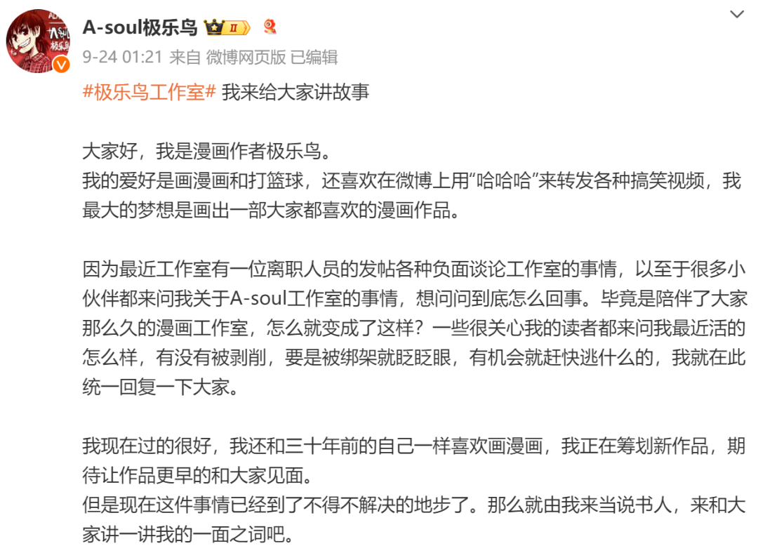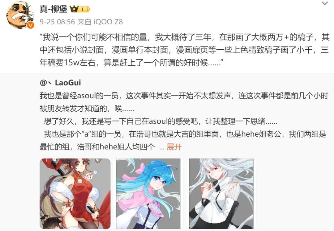 9月22日開始,入行十七年始終供職於A-soul漫畫工作室,今年年初才離職的漫畫創作者柳堡,在微博發佈多條長文控訴A-soul漫畫工作室的多宗罪:公司註冊前的十一年間沒有簽署勞務合同,團隊從未給數十位成員繳納過一次社保和醫保;工作室負責人劉志收藏各類昂貴模型,擁有價值近百萬的車輛,但工作室年入千萬時,數十位創作者常年共用洗漱間和洗衣機,甚至要剋制洗澡頻率;工作室倡導主筆頻繁更換筆名,以至於許多作者多年未能在圈內打出名氣。