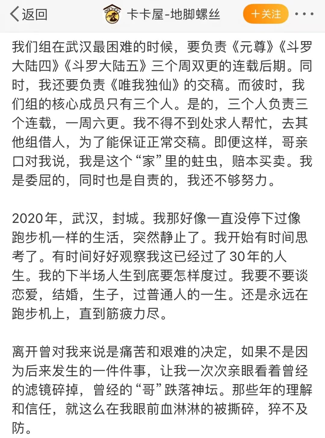 但不少離職員工對此有着不同看法,如微博名卡卡屋的員工發文表示:“我們組在武漢最困難的時候,要負責《元尊》《斗羅大陸四》《斗羅大陸五》三個周雙更的連載後期,同時,我還要負責《唯我獨仙》的交稿。而彼時,我們組的核心成員只有三個人。即便這樣,哥親口對我説,我是這個‘家’裏的蛀蟲,賠本買賣。我是委屈的,同時也是自責的,我還不夠努力。” 卡卡屋提到的“哥”,便是工作室負責人劉志。