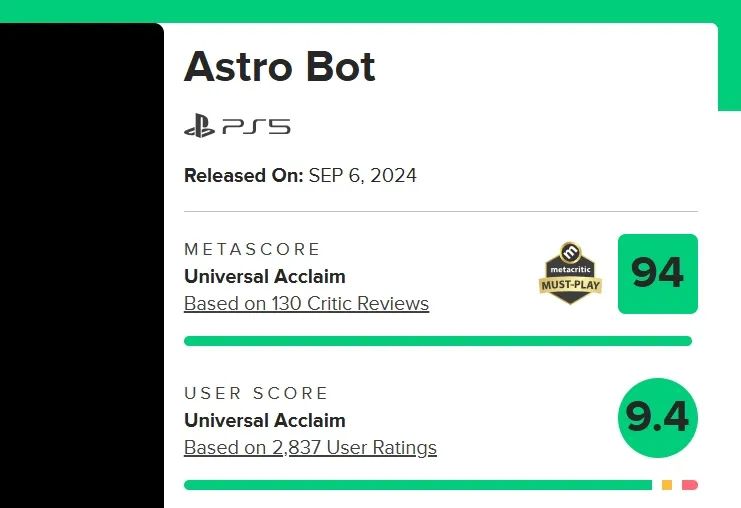 距離《宇宙機器人》發售,已經過去了一個月時間。目前它的MC評分仍維持在94分的超高分,所有給出評分的媒體依然無一例外地給出了好評。
