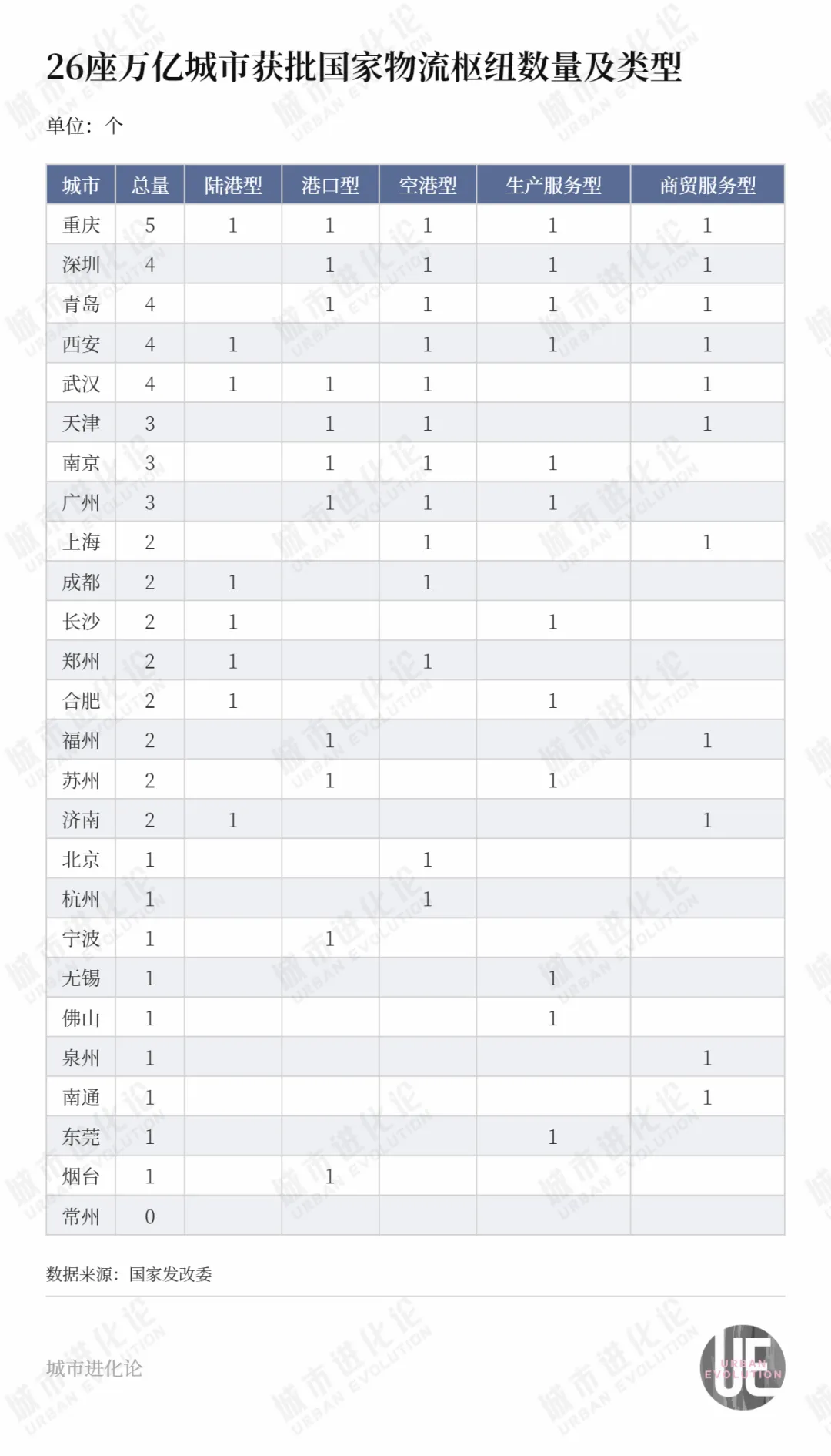 深圳、青島同時擁有港口型、空港型、生產服務型、商貿服務型國家物流樞紐,西安擁有陸港型、空港型、生產服務型、商貿服務型國家物流樞紐,而武漢則擁有陸港型、港口型、空港型、商貿服務型國家物流樞紐。