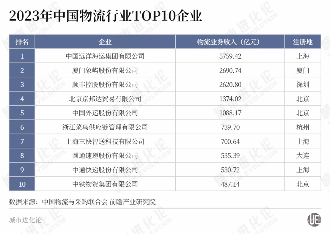實際上,上海和北京本身也是中國物流龍頭企業最密集的區域。2023年中國物流行業TOP10企業有中國遠洋海運集團、廈門象嶼、順豐控股、北京京邦達、中國外運、浙江菜烏、上海三快智送、圓通速遞、中通快遞、中鐵物資集團,上海、北京各佔3家。