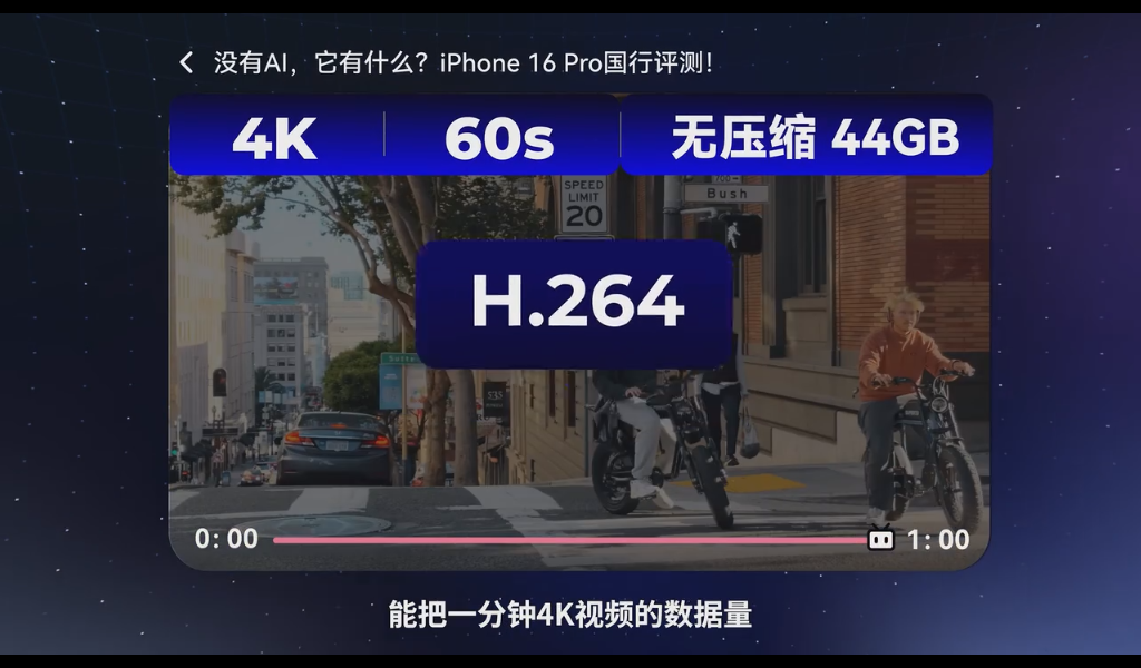 所以採用高壓縮率編碼來壓縮視頻就顯得很有必要。之前廣泛採用的是一個叫H.264的編碼,它可以把4K分辨率1分鐘44GB的視頻容量,壓縮到400MB。