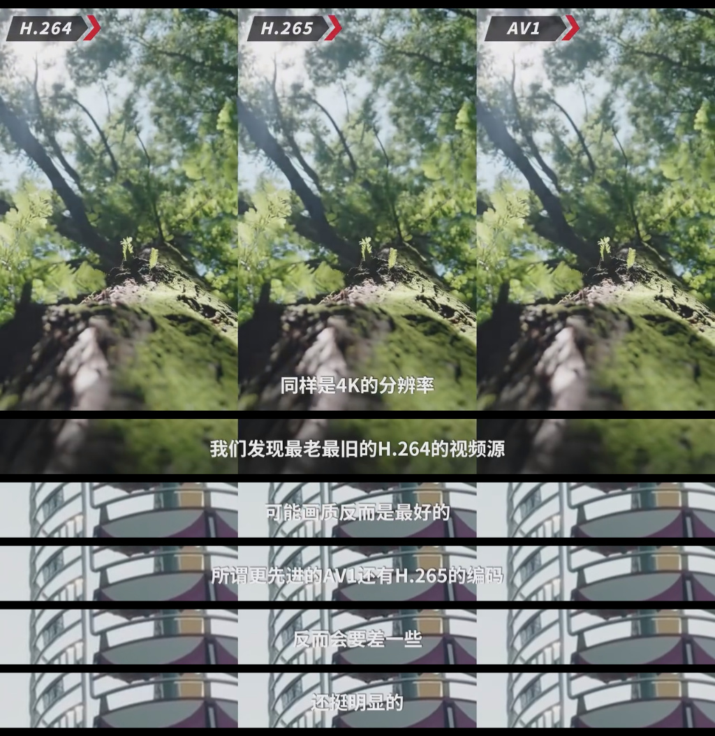 照道理來説,這樣的選擇其實並不是什麼壞事。為不同設備的用户提供不同的、適合用户設備分辨率的視頻源,這其實是一種平台和用户雙贏的選擇。但實際上,經過影視颶風團隊的測試,一些由H.265和AV1這兩個更先進編碼進行壓縮過的、理論上清晰度應該更好的視頻,其實際清晰度反而比老編碼H.264壓縮過的更糊。