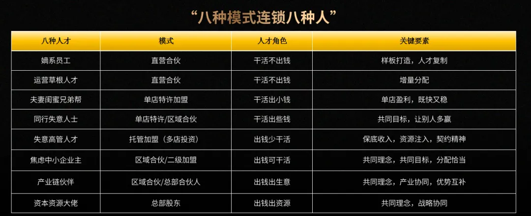 員工、加盟商、合夥人本質上都是和品牌創始團隊一起幹活的人,這三種身份不一定要一成不變,適合做員工的人安排他員工,適合做合夥人就安排他做合夥人,適合做投資人的人就安排他做投資人。一個能團結各種各樣的人企業,才能成功。如果一家企業只能任用一兩種人,長期來看可能還是會出現問題。