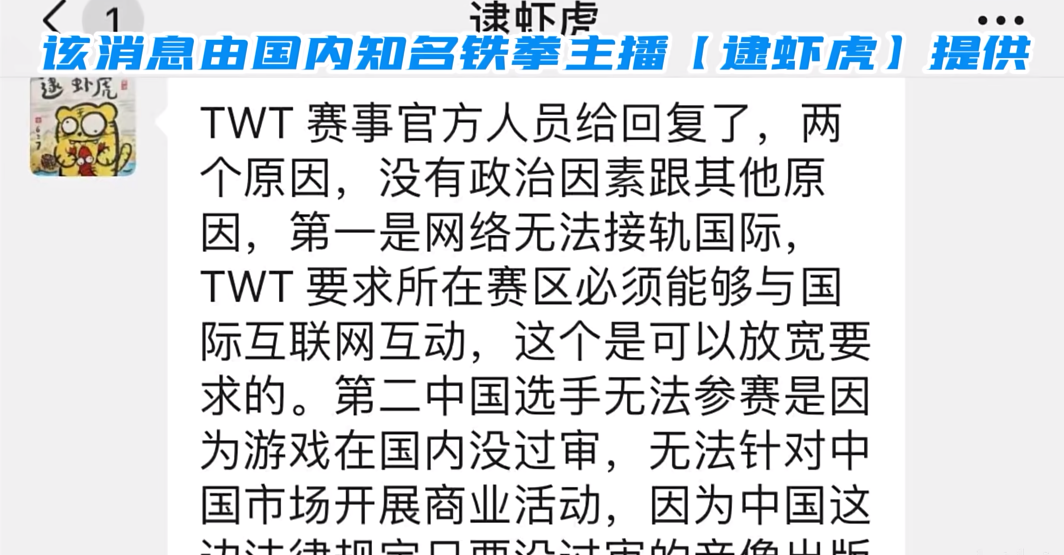 但事實上這兩個理由都站不住腳,先不提為什麼在泰國的比賽會因為中國網絡環境不符合要求所以不讓中國選手參賽,説《鐵拳》因為在國內沒有過審所以無法舉辦相關比賽。那2019年在北京舉辦的《鐵拳7》官方比賽又是怎麼一回事呢?
