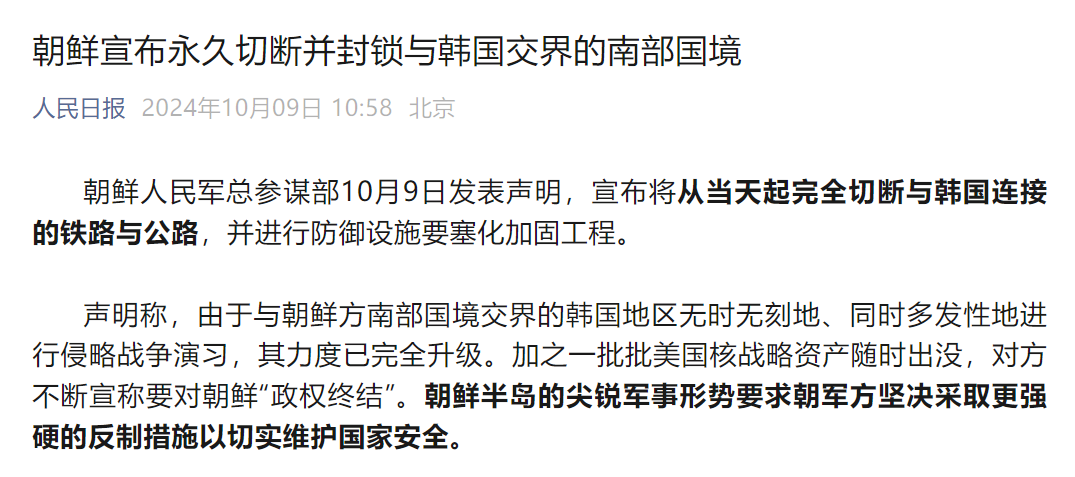 10月9日,朝鮮人民軍總參謀部發表聲明,決議永久切斷與韓國交界的南部邊境鐵路和公路,並且在邊境進行防禦設施要塞化加固工程,相關消息已經通報美國軍方。